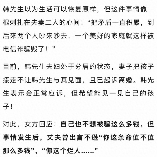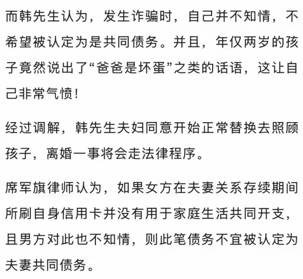 韩先生说,妻子还差一个月生产的时候,突然告诉自己他被诈骗了43万,当时韩先生表示很震惊,你哪里来的这么多钱?妻子说是刷的信用卡。