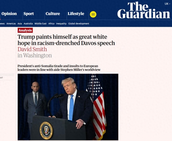 英国《卫报》在当天即刊发长篇分析文章,直 言 特朗普此次演讲 "充斥着种族主义暗示和文明对抗叙事",并认为他正试图在全球舞台上 将自己塑造成 "西方、乃至白人文明的最后希望" 。 分析认为 ,特朗普在达沃斯 演讲 的真正 目的 并非修复跨大西洋关系,而是重构其一贯的政治叙事:通过制造 "文明存亡危机",重新整合国内支持者,并向盟友施加服从性压力。