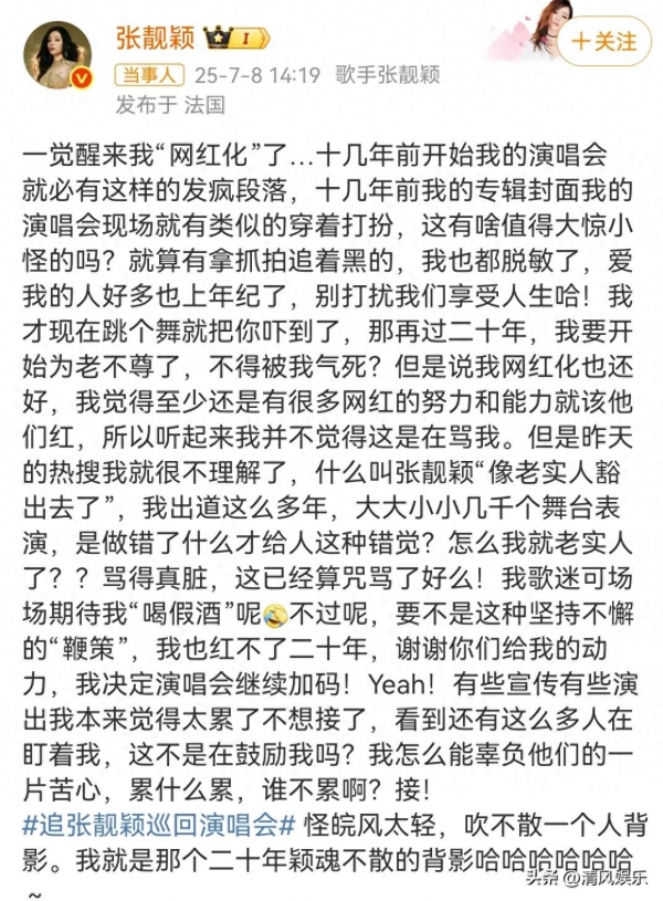 "一觉醒来我'网红化'了……"7月8日,张靓颖在微博上的一句调侃,瞬间点燃网络。短短几句话,带着三分自嘲七分不屑,把一场围绕她的舆论风波硬生生扭成了个人宣言台。