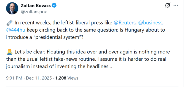 11日当晚,佐尔坦·科瓦奇在社交平台"X"发文就有关消息回应称,"我们要澄清一点:一遍又一遍地散布这个想法,不过是惯用的假新闻套路。"