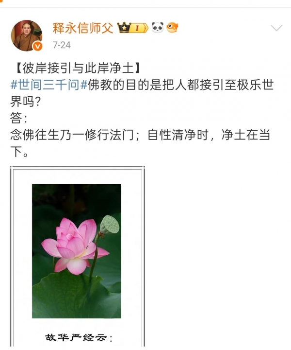 释永信作为少林寺的方丈,一直都是少林寺对外的形象代言人,释永信的为人也十分高调,每天都会在网上分享一些佛法。