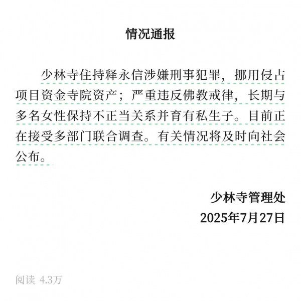 7月27日,释永信携情人潜逃的通报被警方打假后,少林寺官方账号发布的声明,坐实了释永信涉嫌违法犯罪的传言,同时也公布了释永信事件的最新进展。
