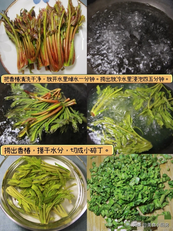 ✅ 香椿芽洗净,放入沸水中焯烫30秒,捞出过凉水沥干,切成碎末