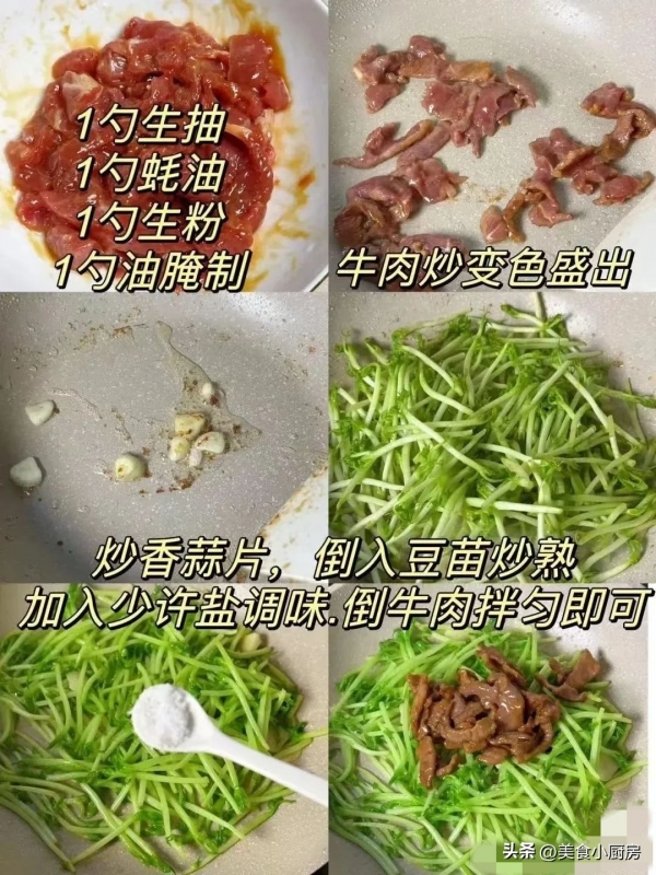 ✅ 准备食材:豌豆苗200g、牛肉150g、生抽1勺、蚝油半勺、淀粉1小勺、盐少许、食用油适量