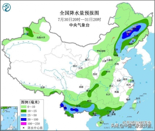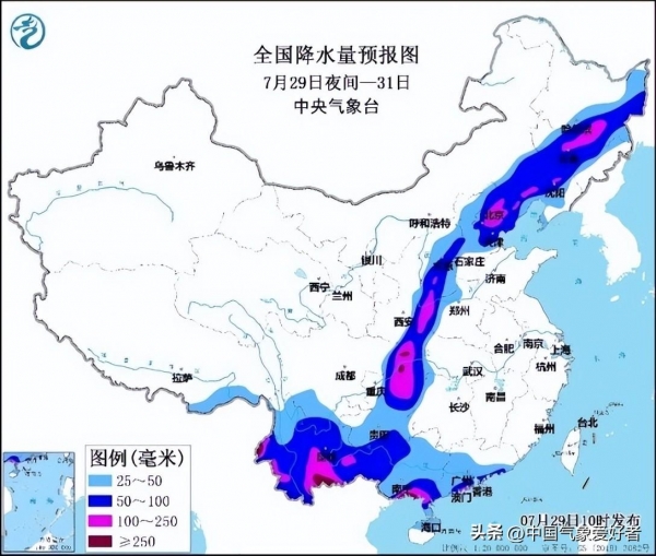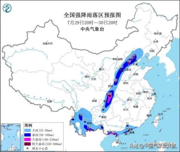 中央气象台在7月29日18时继续发布了暴雨橙色预警,预计在7月29日20时至30日20时,广东南部、广西南部、云南、贵州北部、四川东北部和南部、重庆、湖北西部、陕西东南部、河南西部、山西、河北中北部、北京、天津、辽宁西南部、内蒙古东南部等地将有大到暴雨。其中,重庆中北部、四川东北部、陕西东南部、山西中南部、河南西北部、河北中部、北京西南部和北部、云南东南部、广西南部沿海、广东南部沿海等地的部分地区将有大暴雨,重庆、广西局地特大暴雨(250~300毫米)。