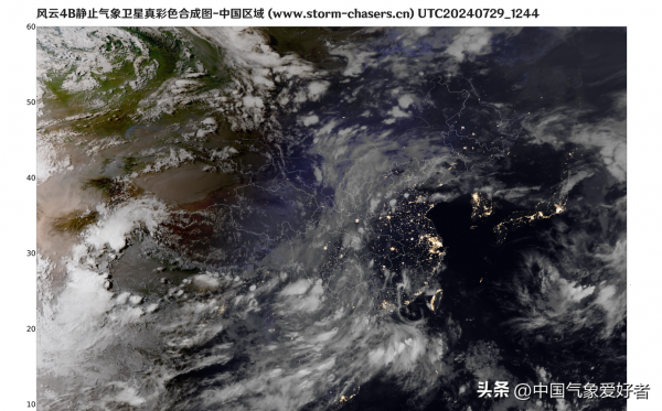 7月29日下午,从风云四号高清可见光卫星云图上可见,深入我国的格美彻底散架,在我国中西部地区变成了大片的散云,之前的螺旋形状似乎也已经消失不见,7月28日中央气象台停止编号后,7月29日台风格美似乎确实要离开天气舞台了。