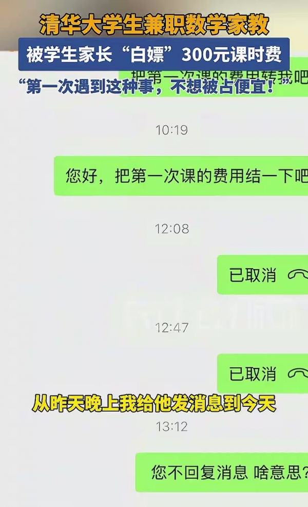 然而,课后他却发现,这位家长的"诚意"只停留在了付款之前。辅导结束后,对方仿佛人间蒸发,消息不回,电话不接。