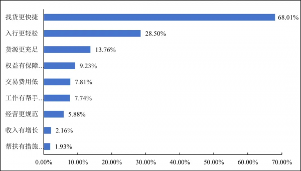 平台找货更快捷是主要优势。调查显示,货车司机认为使用平台最主要的优势是找货更快捷,达到68.01%,远高于其他优势考虑占比。有28.50%的司机表示使用平台入行更轻松。13.76%的司机认为使用平台货源更充足。