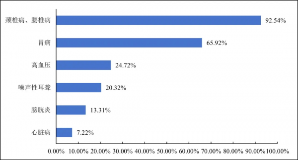 司机健康保障总体仍有差距。调查显示,77.14%的货车司机患有职业病,较上年调查小幅上升。在患有职业病的货车司机中,患有颈椎病、腰椎病的司机占比最多,达到92.54%。患有胃病的司机排名第二,达到65.92%。排第三的是高血压,占比24.72%。