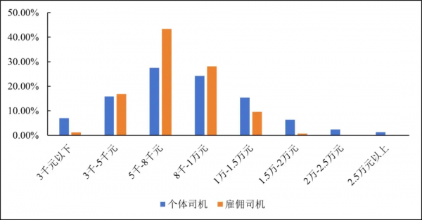 受雇驾驶司机税后月均收入在5000-10000元/月的占比71.50%,总体较为集中。相对个体司机,受雇驾驶司机高收入群体占比较少。