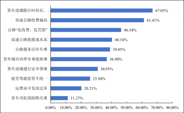 政策保障仍是司机关注焦点。调查显示,对于目前损害货车司机合法权益的政策保障问题,司机反映最多的一是货车进城相关问题,二是与高速公路相关政策问题,三是公路"乱收费、乱罚款"问题以及疲劳驾驶监管问题。