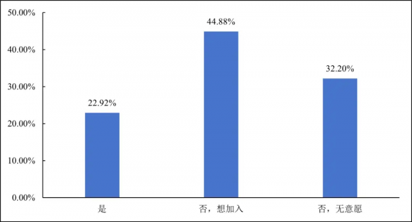货车司机入会意愿较为强烈。调查显示,22.92%的调查司机已经加入各级工会。44.88%的司机表示有意愿加入工会,较上年调查有所增加。