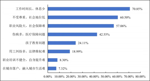 货车司机社会保障问题集中。调查数据显示,困扰货车司机的社会保障问题最大的是工作时间长、休息少,占比70.85%;其次是不受尊重、社会地位低,占比60.50%;第三是职业风险大、社会保障难,占比57.06%,第四是伤病多,医疗保障存在问题,占比42.55%,第五是孩子教育问题难以解决,占比24.11%。