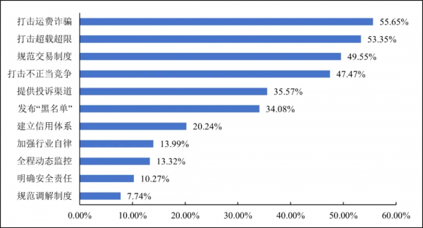 平台保障措施诉求较为集中。调查显示,货车司机认为相关监管部门应出台相关的政策、规范等保障平台的规范化经营。其中,司机认为监管部门最应该加强的保障措施是打击运费诈骗,占比55.65%,其次是打击超载超限,占比53.35%,第三是规范交易制度,占比49.55%,第四是打击不正当竞争,占比47.47%,第五是提供投诉渠道和发布"黑名单",占比在三分之一以上。