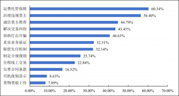 平台保障服务需求较为强烈。调查显示,货车司机认为平台应该加强的保障服务,最需要加强的是运费托管保障,占比60.34%。其次是货主资质管理,包括治理违规货主和诚信货主推荐,分别占56.4%和44.79%。第三是法律纠纷协调,包括解决交易纠纷、协助打击诈骗、真实业务验证,分别占43.45%、40.63%和32.51%。