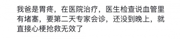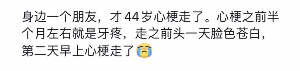 最初是牙疼、牙龈疼痛,家人以为是"上火",未加重视;疼痛持续一天后,左后背和肩膀也开始出现疼痛;直到第三天早上,突发胸痛,才紧急送医。