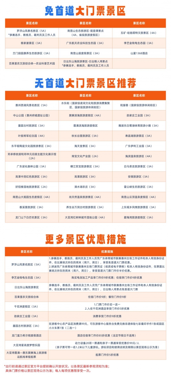 持球票或工作证件,在比赛当周周末畅游惠州50+景区,享受专属优惠。