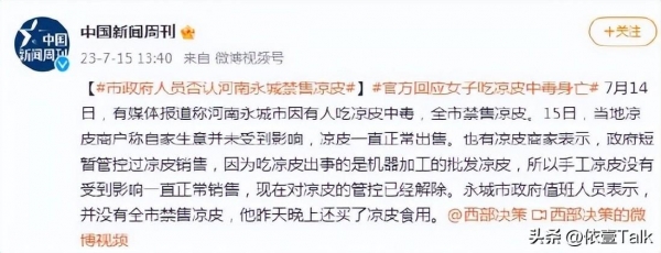 2023年7月23日,河南永城两名女子,因吃凉皮导致中毒,后1死1伤,经检测两人是米酵菌酸中毒。