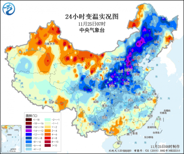 中央气象台11月25日06时继续发布大风蓝色预警。