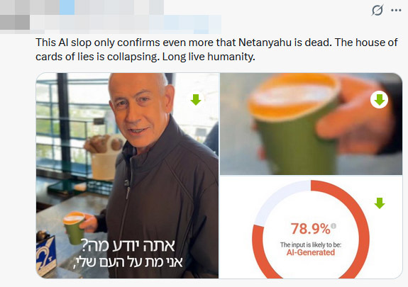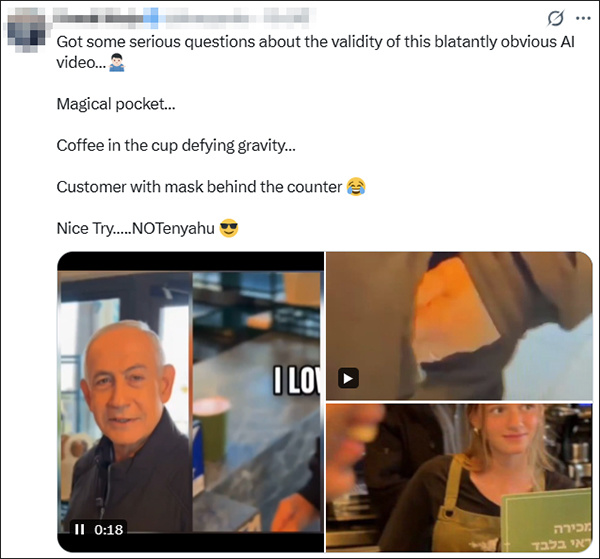 近日,有传言称内塔尼亚胡在伊朗的报复袭击中死亡,还有传言称内塔尼亚胡3月12日的记者会视频是由人工智能(AI)生成的,因为模糊的视频中曾出现似乎一只手"有六根手指"的画面。