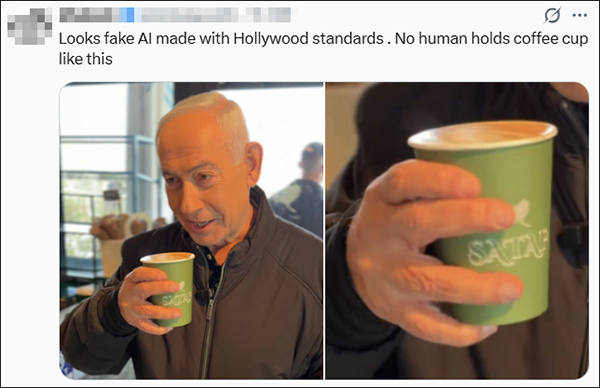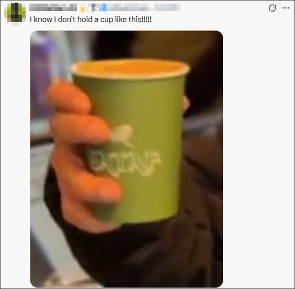 有网友提出其端咖啡杯的姿势不寻常。"我知道我不这样拿杯子。""没有人类会像这样端着咖啡杯。"