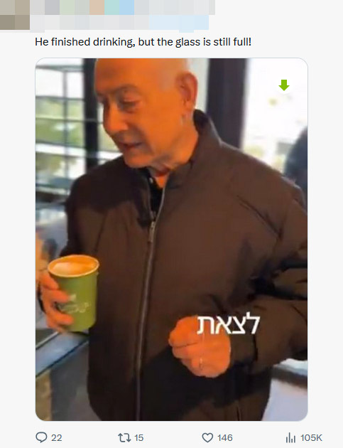 视频中的内塔尼亚胡,还喝了口咖啡,并可见喉部有吞咽动作。但有网友发现,杯子居然还是满的。