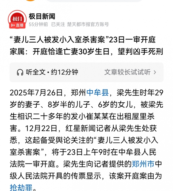 这案子,后天,也就是12月23日,就要在中牟县人民法院一审开庭了。巧的是,这天正好是梁先生亡妻30岁的生日。家属的诉求只有一个:判凶手崔某某死刑,立即执行。