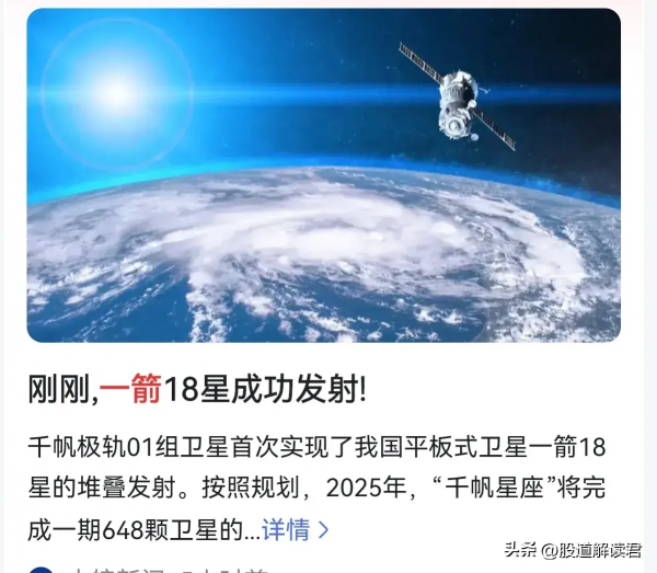 昨晚"一箭18星"顺利升空入轨后,解读君专门写了文章分析商业航天产业未来3-4年的发展规划,以及三大发展路径,今天关于民营资本参与的意见已经发布,后续会推进卫星互联网业务准入制度。
