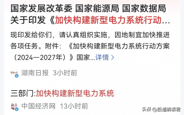 消息面上:一委两局共同印发《加快构建新型电力系统行动方案》提出2024年-2027年重点开展9项专项行动,推进新型电力系统建设取得实效。