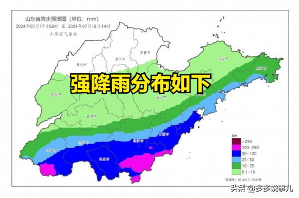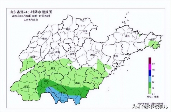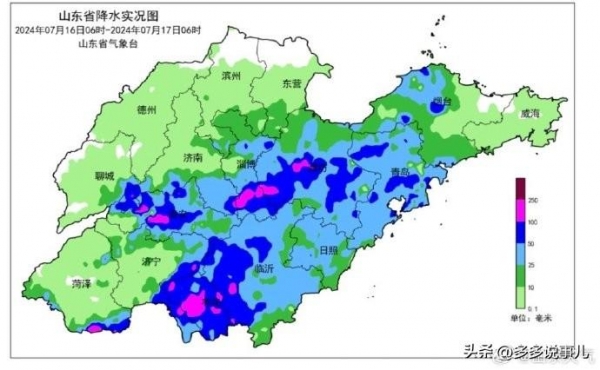 山东气象台在今天上午的11时左右,发布暴雨黄色预警,在今天下午~夜间,南部地区仍有强降水,大雨和暴雨主要分布在:菏泽南部、济宁南部、枣庄、临沂南部、日照和青岛南部,局部地区最大降雨量达到250毫米左右。除这些区之外的周边地区,像菏泽北部、济宁北部、临沂北部、聊城、泰安、济南、淄博南部、潍坊、青岛北部、烟台和威海等有中到大雨,降雨强度相对较弱。
