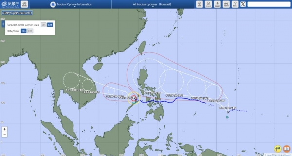 今年第25号台风"海鸥"的中心今天(5日)上午8点钟位于越南嘉莱省归仁市东偏南方向约1100公里的南海东南部海面,就是北纬11.6度、东经119.1度,中心附近最大风力有13级(40米/秒),中心最低气压为960百帕,七级风圈半径250-330公里,十级风圈半径120-150公里,十二级风圈半径50公里。