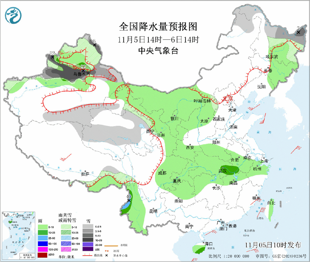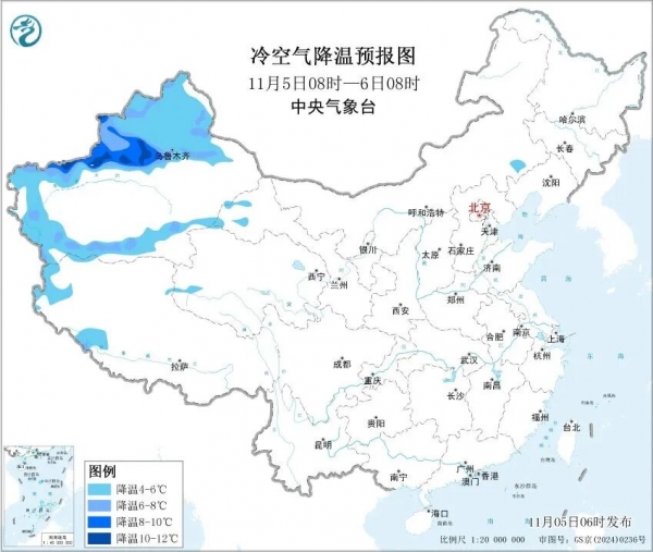受新一轮较强冷空气影响,11月首轮大范围雨雪将至。今起至9日,冷空气将自西向东横扫我国。今明两天,新疆、内蒙古西部、青藏高原中北部率先迎击,气温速降4~8℃,新疆西北、内蒙古西端、东北北部和东部局地降幅超10℃。