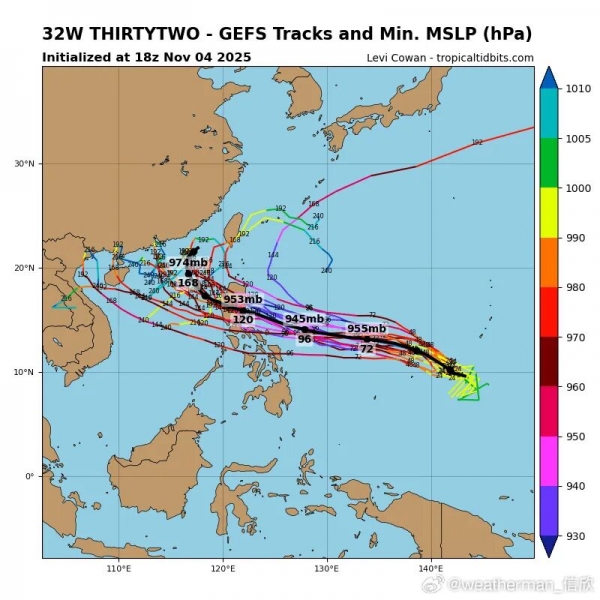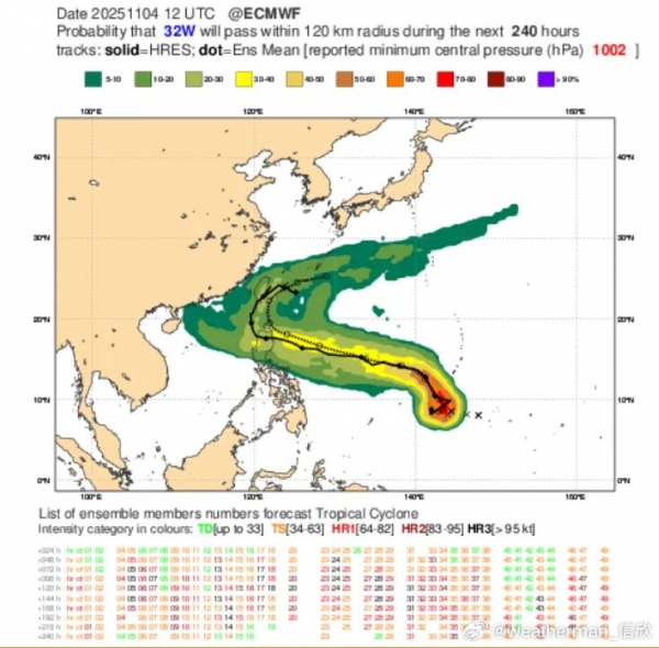 另外,在关岛南侧的热带低压32W正趋于加强,预计今日将发展为今年第26号台风"凤凰"。未来受高海温及减弱的垂直风切变影响,增强条件有利,有达超强台风级别的潜力。未来将靠近菲律宾后路径不确定性较大,也可能成为今年最后一个影响我国沿海的台风,但其是否登陆尚存较大变数,需持续关注。