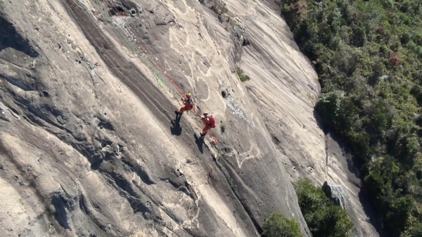 早上6时许,天露微光,消防员立即借助自然光线对崖壁进行了精准勘察,发现被困男子距离山顶约有200米左右的高度差,其间的崖壁近乎垂直,消防员迅速寻找坚固处设置锚点,逐步接近被困男子。