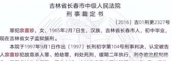 1999年10月27日,宗喜珍改判无期徒刑,2016年宗喜珍因狱中表现优良提前出狱。