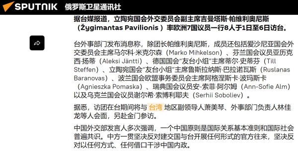 据台媒爆料称,近日立陶宛国会外交委员会副主席率领欧洲7国议员窜台,时间长达6天,这些国家包括爱沙尼亚、芬兰、德国、立陶宛、波兰、瑞典、乌克兰,期间计划跟萧美琴等人见面,还打算跑去金门,力挺台当局跟大陆作对的意图不言自明,这是公然的支持"台独"。