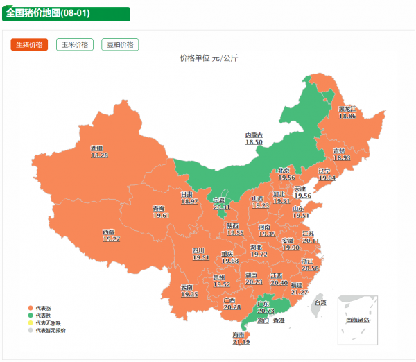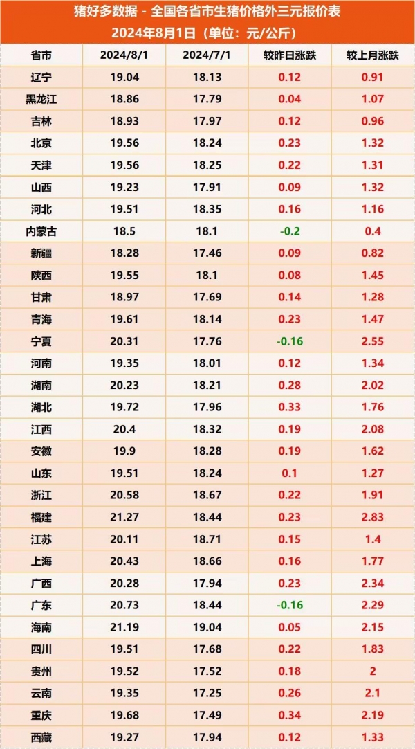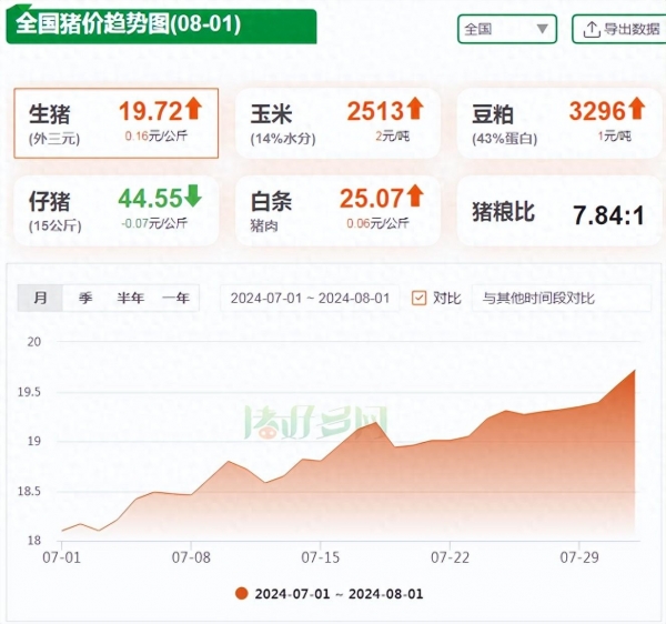 上涨加速!8月开局猪价喜迎"开门红",延续了7月猪价上涨的势头,且涨幅也相对可观!据猪好多数据监测显示,8月1日,全国外三元生猪价格为19.72元/公斤,较昨日上涨0.16元/公斤,直逼20元/公斤。月初养殖端缩量出栏,市场供应偏紧,猪价结束"分分涨"模式,开始加速狂奔。
