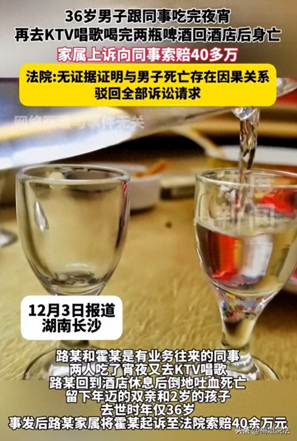 湖南长沙,某晚,36岁的路某和霍某凑到一起,本来是想好好放松一下,先去吃了夜宵,俩人边吃边喝,之后又转场去了KTV,接着喝、接着玩。谁能料到,这场普通的朋友小聚,最后竟变成了天人永隔,路某没了,霍某还被送上了被告席,索赔40多万。