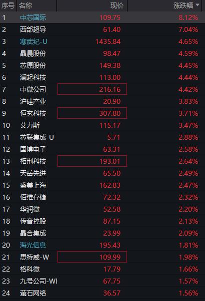科创50指数涨幅扩大至3%,西部超导、中芯国际、寒武纪领涨,成分股中仅3只个股下跌。