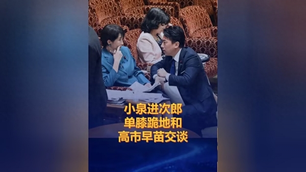 在这样的背景下,小泉进次郎跳了出来。他在国会质询的火爆现场,试图接替高市的讲话,为其结尾,被拒绝后,竟然当众单膝跪在坐下的高市身旁,这在日本政治文化中是一个极度离谱的动作。