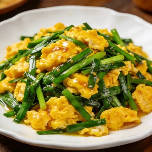 3. 炒制步骤:锅中放适量食用油,油热后倒入蛋液,炒至定型后盛出备用;锅中留少许底油,下葱花爆香,放入韭菜段快速翻炒1分钟,至韭菜变软断生;加入炒好的鸡蛋,翻炒均匀,加少许盐调味即可,全程大火快炒,保留韭菜的鲜香和营养。