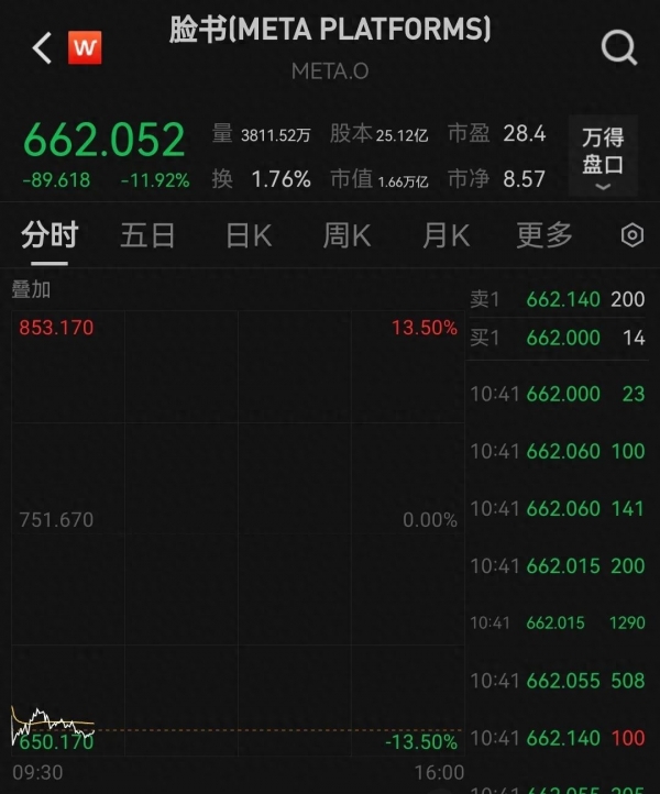 当地时间10月30日,Meta股价开盘一度下跌13.5%,创下2024年4月以来最大跌幅。截至发稿,其股价报662.052美元,市值约为1.66万亿美元,当日市值蒸发了约2260亿美元(约合人民币16000亿元)。