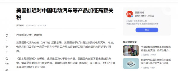 首先,上个月底,美国贸易代表办公室(USTR)就发表了一份声明,宣称原定于8月1日生效,对中国电动汽车加征到100%关税的事项延后了。