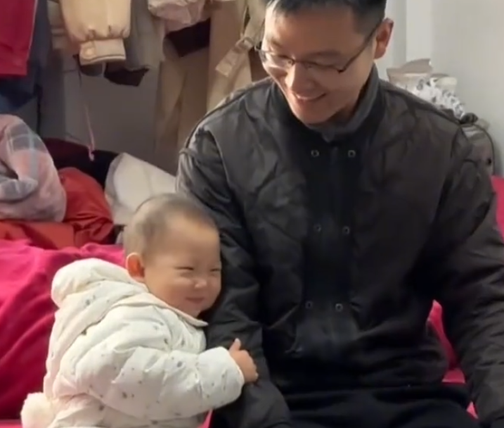据视频显示,女儿紧挨着爸爸坐在床上,突然女儿抱住爸爸的胳膊甜甜地笑起来了,原来是对面地妈妈要给女儿和爸爸拍照,女儿可能意识到了妈妈在拍照就抱住爸爸甜甜的笑起来了。
