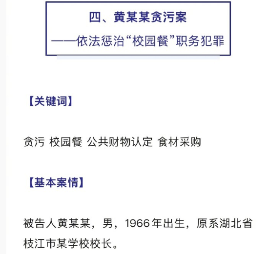 这名校长叫黄某某,1966年出生,之前在枝江好几所学校当校长。从2011年到2021年这十年里,他借着自己当校长的权力,要么自己动手,要么跟别人合伙,专打学生校园餐经费的主意。他的套路很简单,就是在食堂买蔬菜、肉、米面这些食材时,故意多报采购数量,让学校给供应商付更多的货款,之后再让供应商把多付的钱退回来,就这么一点点把钱揣进自己口袋,前后一共贪了90万元。