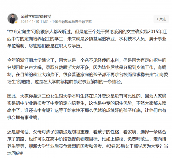 目前现在大家考公的热度,考研的热度依然很高涨,可是很多人确实没有听说过"中专定向生",对于这些学生来说,未来的规划很美好,可是在现实层面当中,自己一个大学名校毕业的学生,毕业之后找不找得到工作是一个问题。