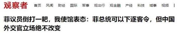 我使馆发言人霸气表示,由于只有菲总统马科斯有权要求大使离任,如果中国大使收到马科斯的离任通知,会立即离开,但他将会为此感到无比骄傲与荣耀,因为他用实际行动践行了一名中国外交官对国家作出的坚定承诺。