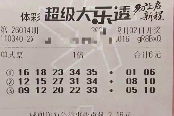 2月2日大乐透26014期开奖,安徽池州彩民凭一张6元赠票拿下1000万一等奖,这张幸运票竟是购买18元套餐票的附赠福利,实票曝光后瞬间引爆彩民圈。