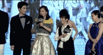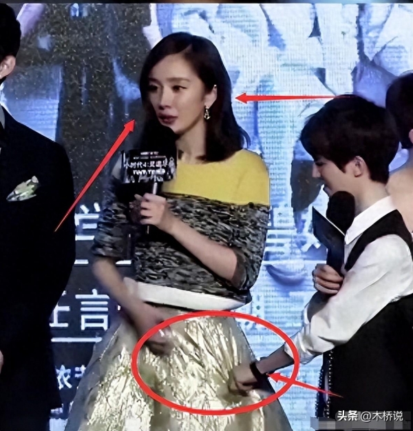 杨幂不得不放下手中的话筒,一手提着裙子,一手继续回答记者的提问。