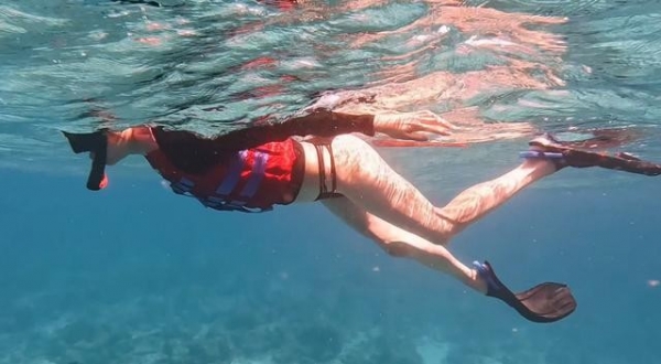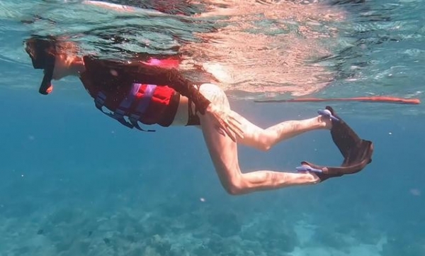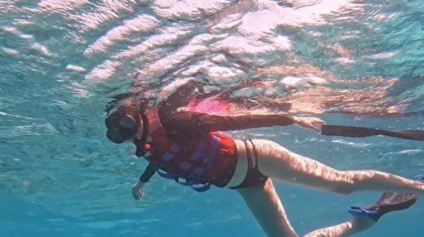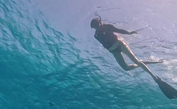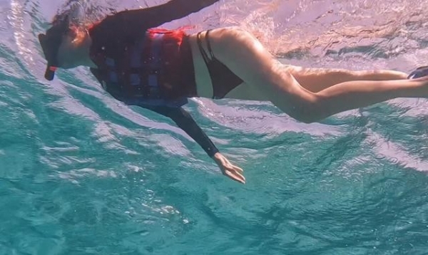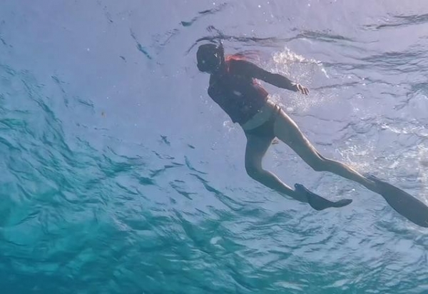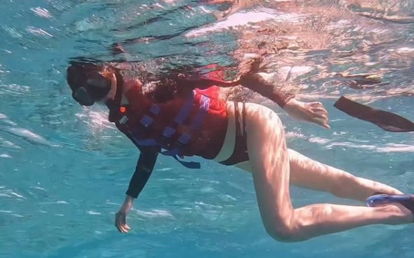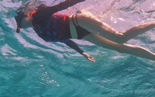 视频里她戴着专业的潜水镜,穿着救生衣,动作挺熟练的。虽然没潜多深,就在海面下边扑腾,但那架势一看就是练过的。